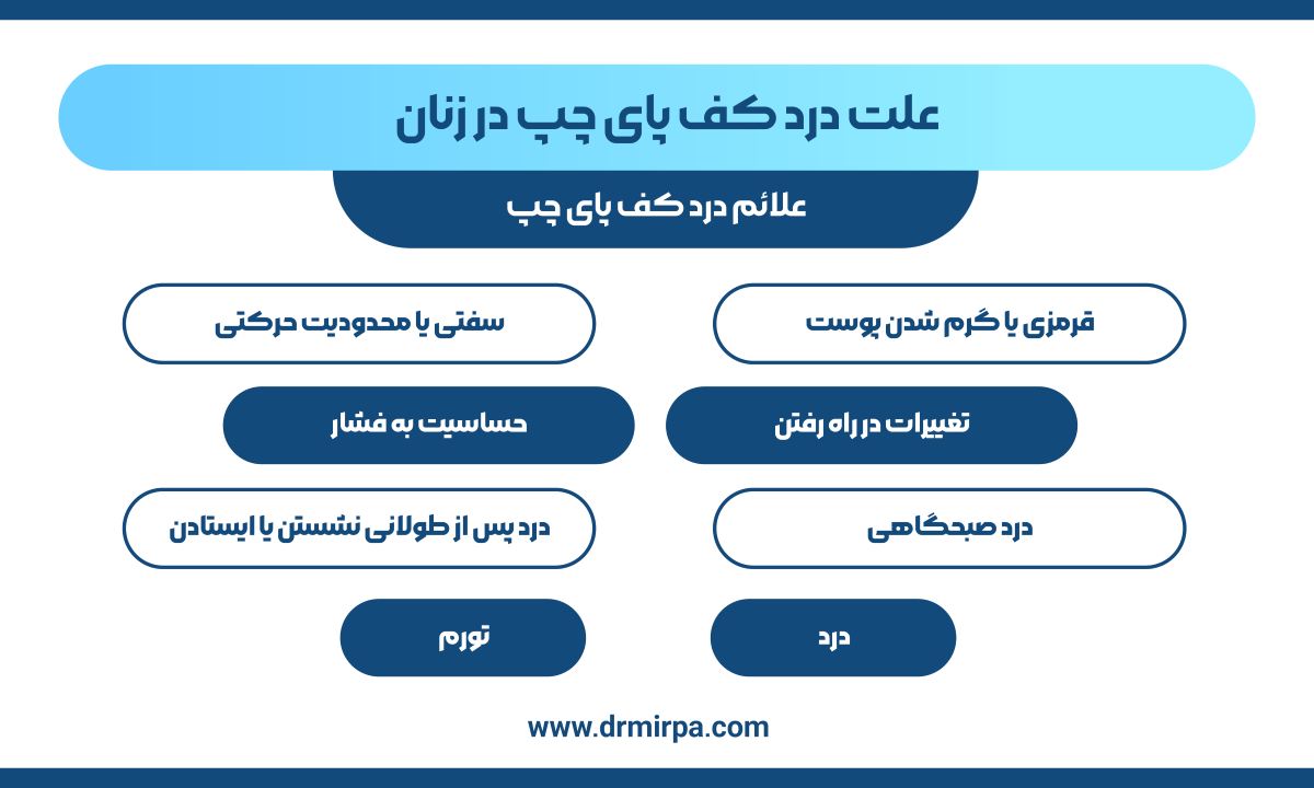 علائم درد کف پای چپ میتوانند بر اساس علت اصلی متفاوت باشند اما برخی از نشانهها و علائم رایج عبارتند از: