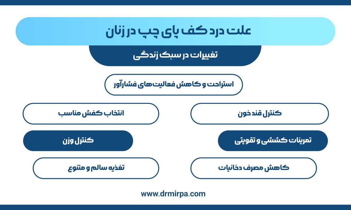 علت درد کف پای چپ در زنان ممکن است به عوامل مختلفی از جمله: مشکلات استخوانی و مفصلی، التهاب عضلات و بافتهای نرم، کمبود ویتامینها و مواد معدنی، عوامل زندگی روزمره، و حتی عوامل روانی بستگی دارد. بنابراین، درمان را جدی بگیرید و برای جلوگیری از تشدید آن هر چه سریعتر به پزشک مراجعه کنید.